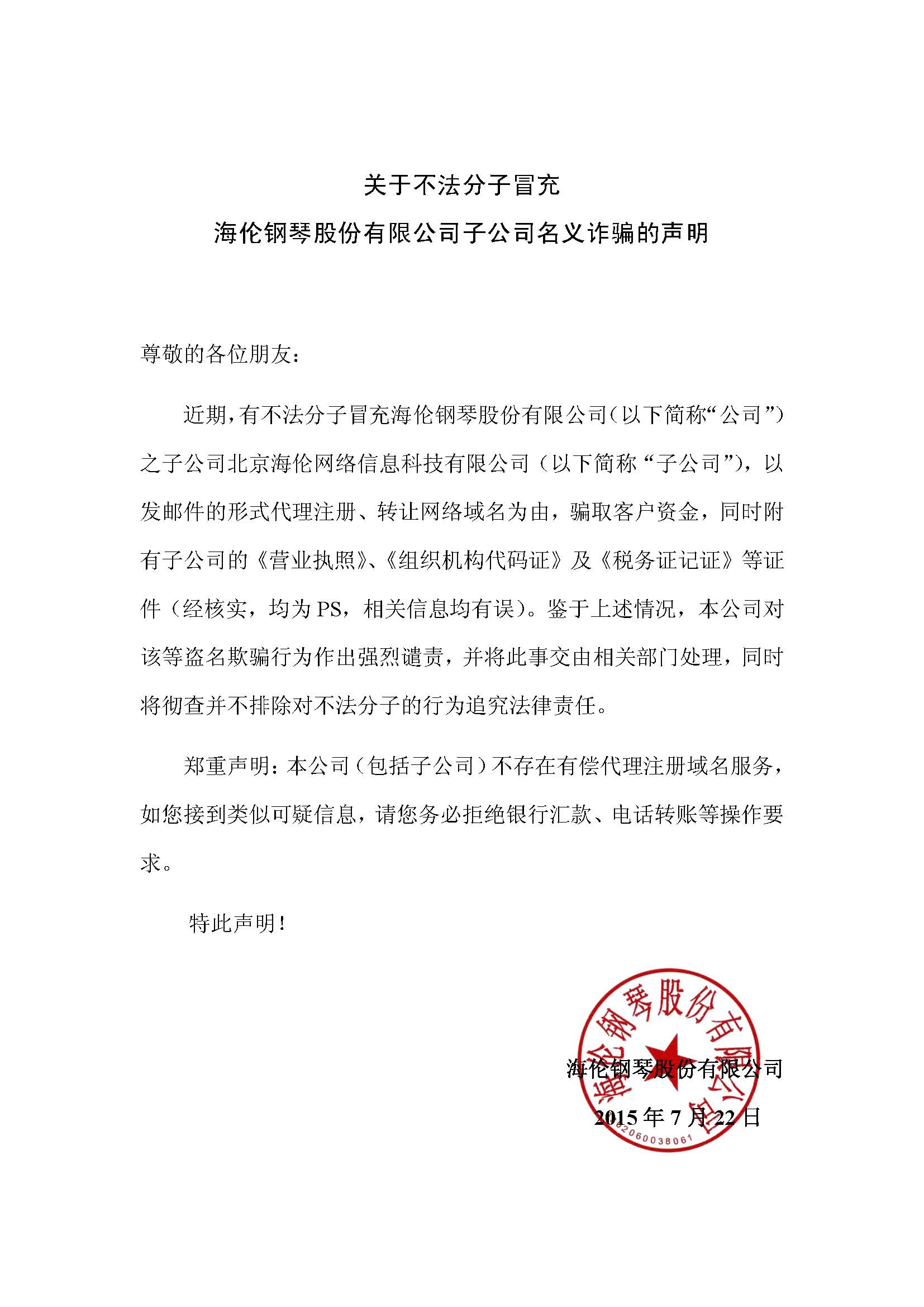 關(guān)于不法分子冒充海倫鋼琴股份有限公司子公司名義詐騙的聲明