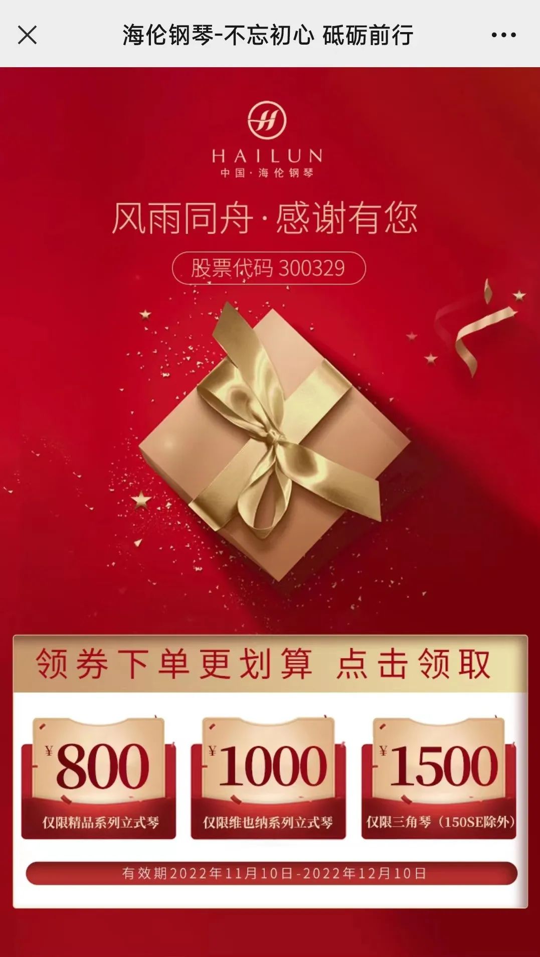 關(guān)注“海倫鋼琴”官方微信公眾號,回復(fù)“上市十周年”,點(diǎn)擊領(lǐng)取福利進(jìn)入領(lǐng)券頁面;