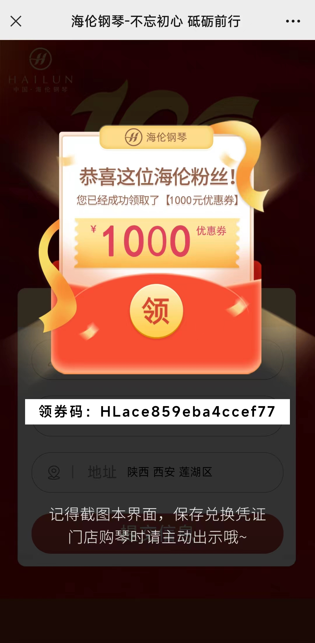 填寫信息領(lǐng)取獨(dú)屬于您的優(yōu)惠券碼,記得保存領(lǐng)券碼截圖哦,有效期內(nèi)憑領(lǐng)券碼截圖到當(dāng)?shù)睾愪撉俟俜绞跈?quán)店使用。(線下購買時,將姓名、電話號碼及領(lǐng)券碼展示給海倫鋼琴官方授權(quán)門店就可以獲得優(yōu)惠啦)