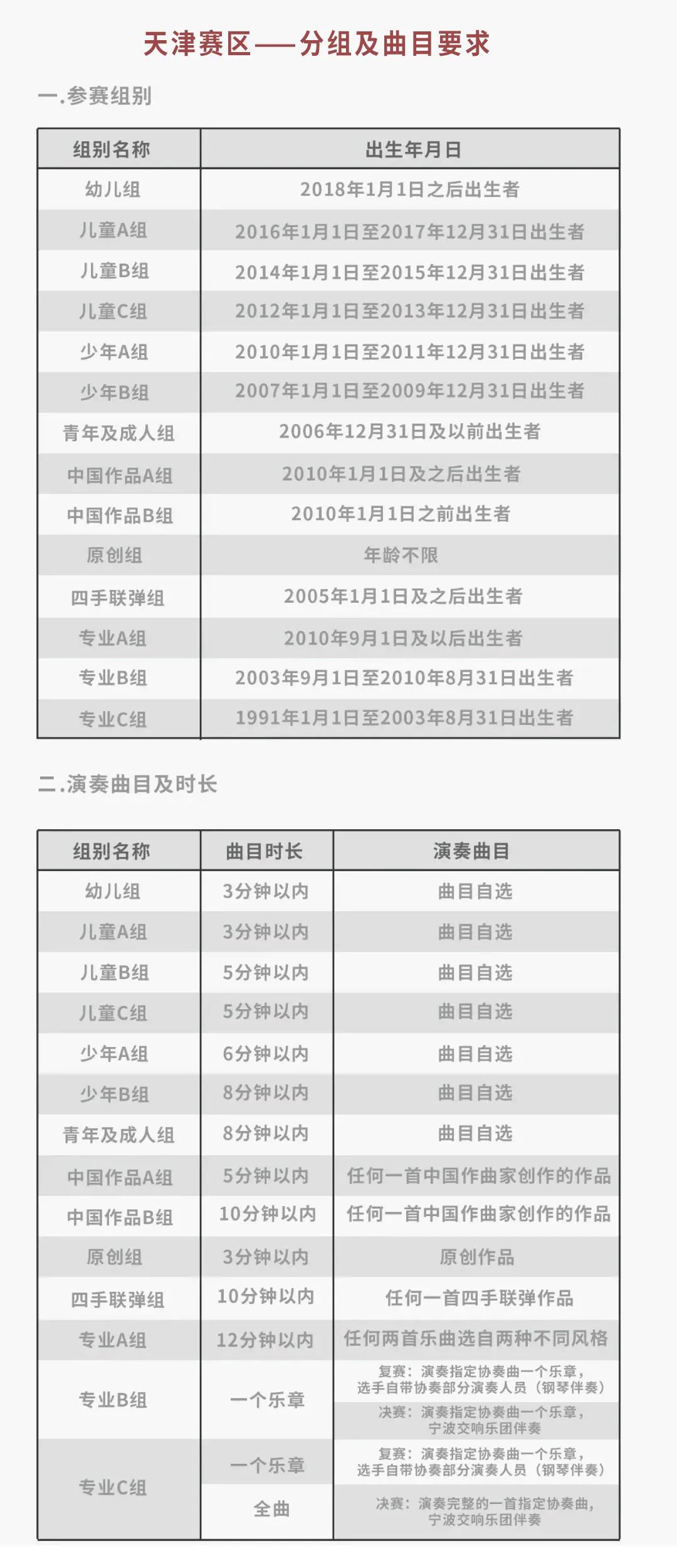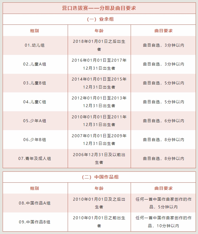 04. 天津區(qū)域選拔賽各組別只進行一輪比賽,演奏時長參考分組細則,要求背譜演奏,服裝整潔,臺風大方,演出服及化妝請選手自行安排;