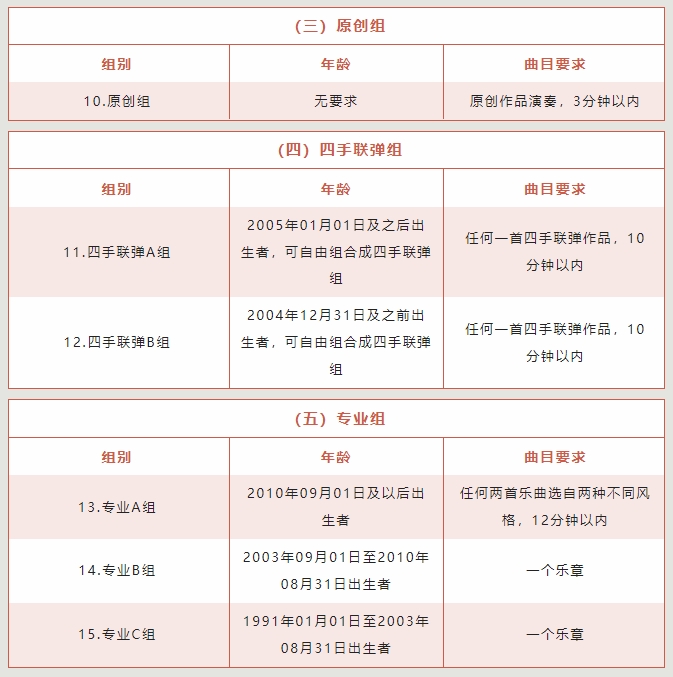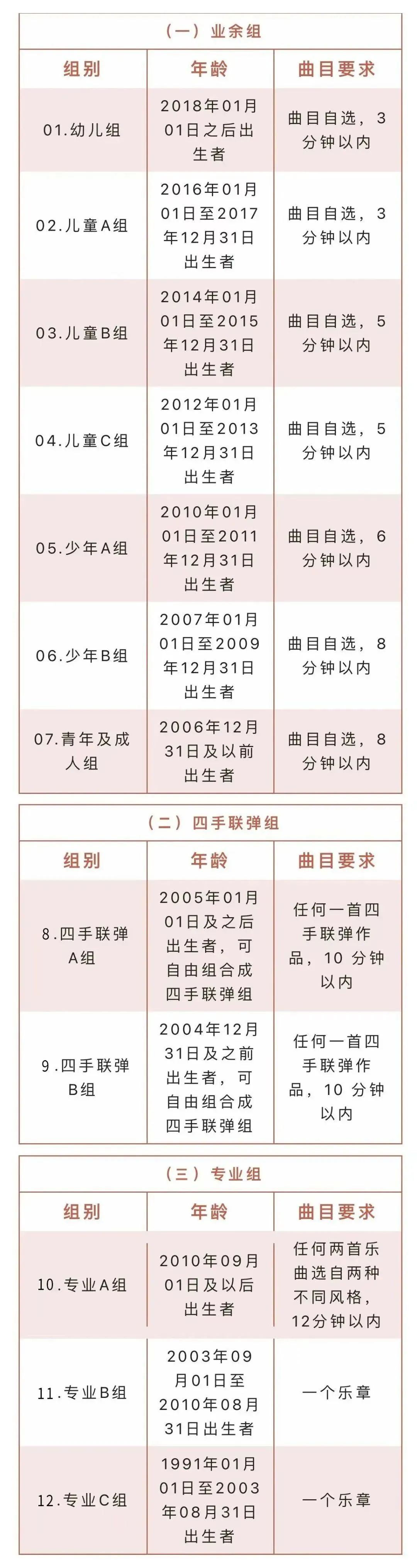 07. 業(yè)余組:參賽選手不限國籍,均可報名參加(業(yè)余選手即社會業(yè)余鋼琴學生,參賽報名時未入讀音樂藝術(shù)院校、系科)。參賽者只可參加本年齡組或高年齡組的一個年齡組別的比賽;